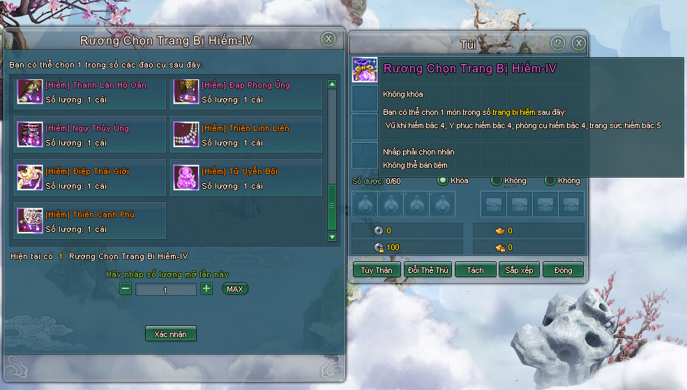 | Rương Chọn Trang Bị Hiếm-II | Bạn có thể chọn 1 trong các trang bị hiếm sau đây: Vũ khí hiếm bậc 5, Trang sức hiếm bậc 6, Y phục hiếm bậc 6, Phòng cụ hiếm bậc 6 |